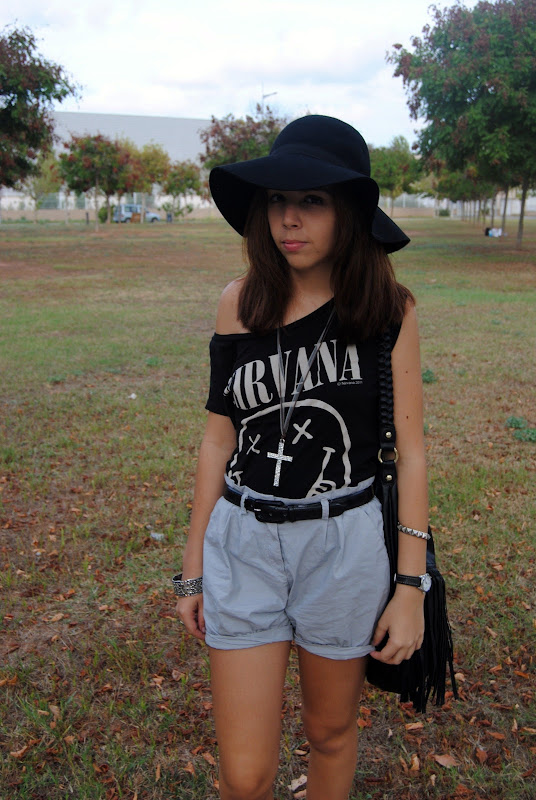 ¡Qué preciosidad de camiseta! Me muero por conseguir una camiseta de Nirvana, pero no hay manera. H&M me queda un poco lejos y no consigo ahorrar para ir y atracarlo a lo grande, así que en fin, me quedaré con las ganas de conseguir una camiseta tan guay como la tuya. Y ya de paso también una pamela tan rompedora. ¡Con lo que me gustan a mí esas cosas y mira que no tener ninguna! Lo mío es un pecado, vamos.